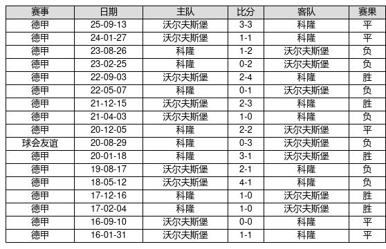 科隆 VS 沃尔夫斯堡两队近10年的交战次数为17场,科隆5胜5平7负,赢球概率为29.4%,平局概率为29.4%,输球概率为41.2%。