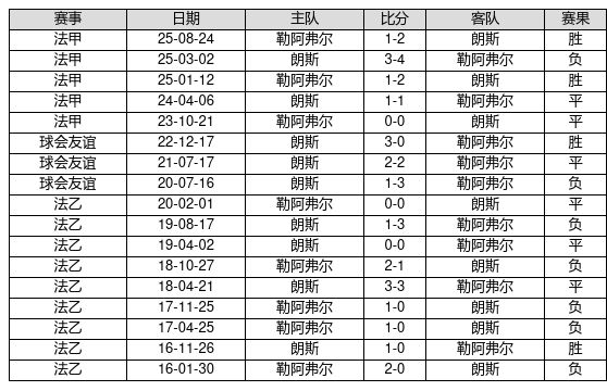 朗斯 VS 勒阿弗尔两队近10年的交战次数为17场,朗斯4胜6平7负,赢球概率为23.5%,平局概率为35.3%,输球概率为41.2%。