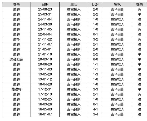 吉马良斯 VS 莫雷拉人两队近10年的交战次数为22场,吉马良斯12胜6平4负,赢球概率为54.5%,平局概率为27.3%,输球概率为18.2%。