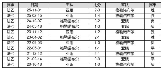 格勒诺布尔 VS 亚眠两队近10年的交战次数为11场,格勒诺布尔4胜2平5负,赢球概率为36.4%,平局概率为18.2%,输球概率为45.5%。