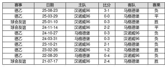 马格德堡 VS 汉诺威96两队近10年的交战次数为10场,马格德堡3胜2平5负,赢球概率为30.0%,平局概率为20.0%,输球概率为50.0%。